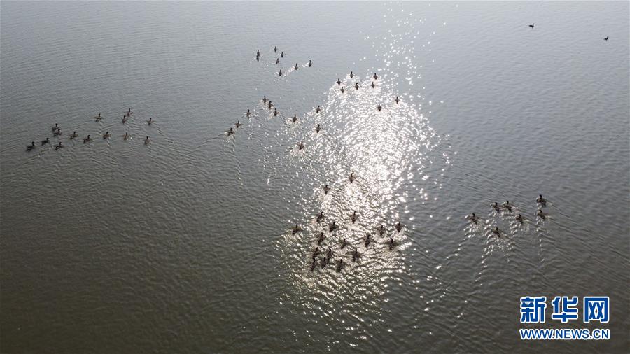 12月15日在菜子湖湿地拍摄的候鸟(无人机拍摄)。 入冬以来,大批候鸟飞抵位于安徽省安庆市的菜子湖湿地越冬。 新华社记者 张端 摄