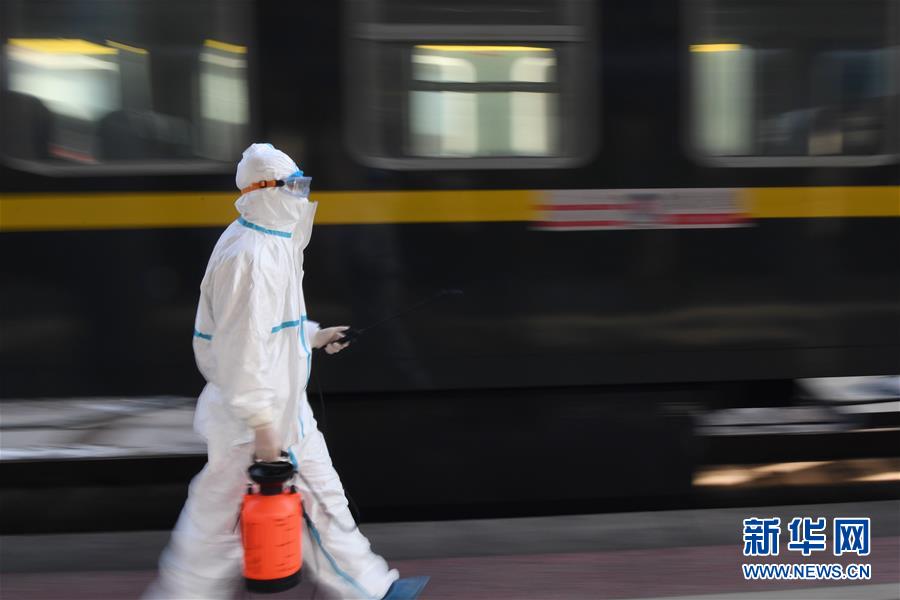 2月3日,中国铁路兰州局集团有限公司疾病预防控制所工作人员杨凯从K9668次列车旁走过。 为做好新型冠状病毒感染的肺炎疫情防控工作,中国铁路兰州局集团有限公司疾病预防控制所的工作人员近期全天候轮班上岗,对兰州火车站的列车开展消毒防疫工作,确保列车重点部位经过严格细致的消毒。 新华社记者 陈斌 摄