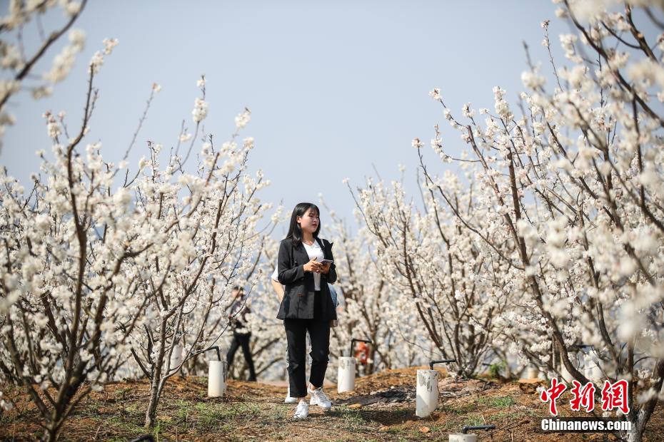 2月25日,一名游客在空旷的樱桃园内游览。近日,贵州省毕节市纳雍县的万亩樱桃花竞相绽放,吸引部分民众前去游玩观赏。中新社记者 瞿宏伦 摄