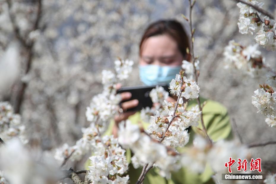 2月25日,游客用手机拍摄樱桃花。近日,贵州省毕节市纳雍县的万亩樱桃花竞相绽放,吸引部分民众前去游玩观赏。 中新社记者 瞿宏伦 摄