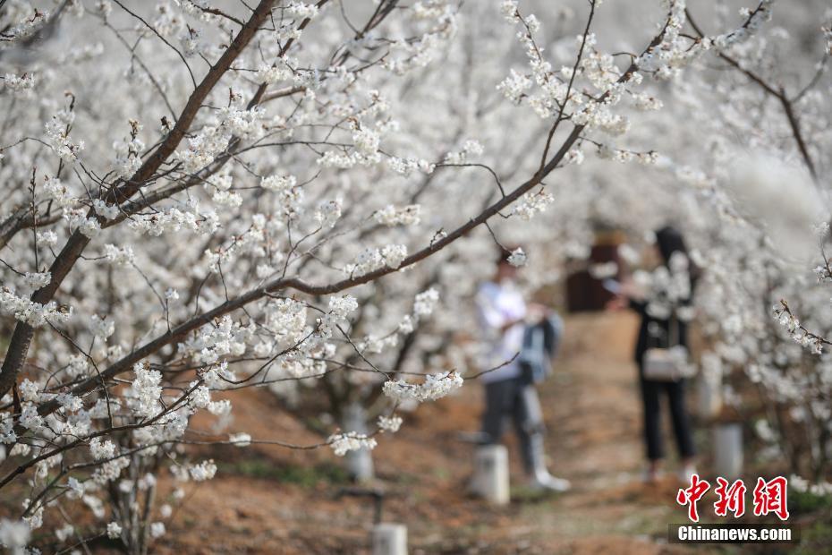 2月25日,游客在樱桃园内游览。近日,贵州省毕节市纳雍县的万亩樱桃花竞相绽放,吸引部分民众前去游玩观赏。 中新社记者 瞿宏伦 摄