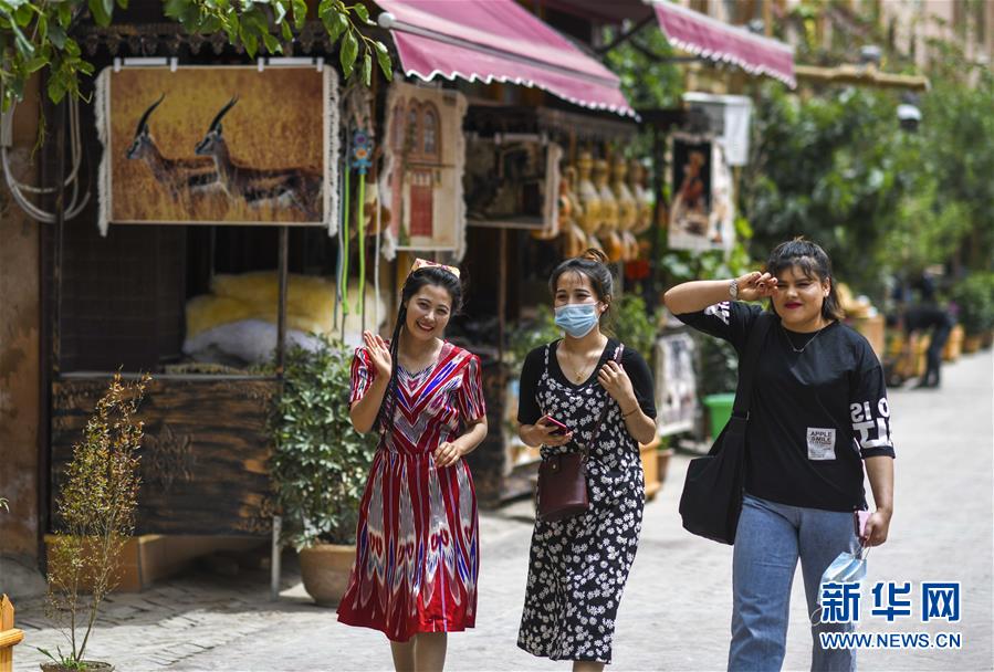 居民行走在新疆喀什古城景区内(5月16日摄)。 入夏以来,新疆喀什古城景区在做好疫情防控的同时,不断优化景区旅游环境、提升服务质量,为各地游客提供更好的旅游体验。 新华社记者 赵戈 摄