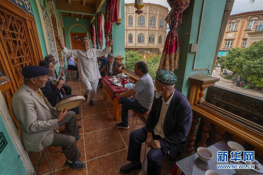 在新疆喀什古城景区内的百年老茶馆阳台上,当地居民在跳舞、聊天(5月17日摄)。 入夏以来,新疆喀什古城景区在做好疫情防控的同时,不断优化景区旅游环境、提升服务质量,为各地游客提供更好的旅游体验。 新华社记者 赵戈 摄