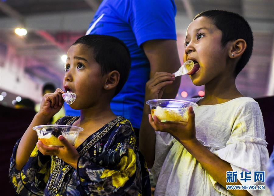 在新疆和田夜市环湖店,小朋友在品尝酸奶蜂蜜粽子(5月16日摄)。 5月中旬以来,新疆和田气候渐暖,当地旅游经济逐步复苏,笑迎八方游客。和田的夜市逐渐热闹起来,吸引不少游客前来打卡,品尝美食,欣赏歌舞。 新华社记者 王菲 摄
