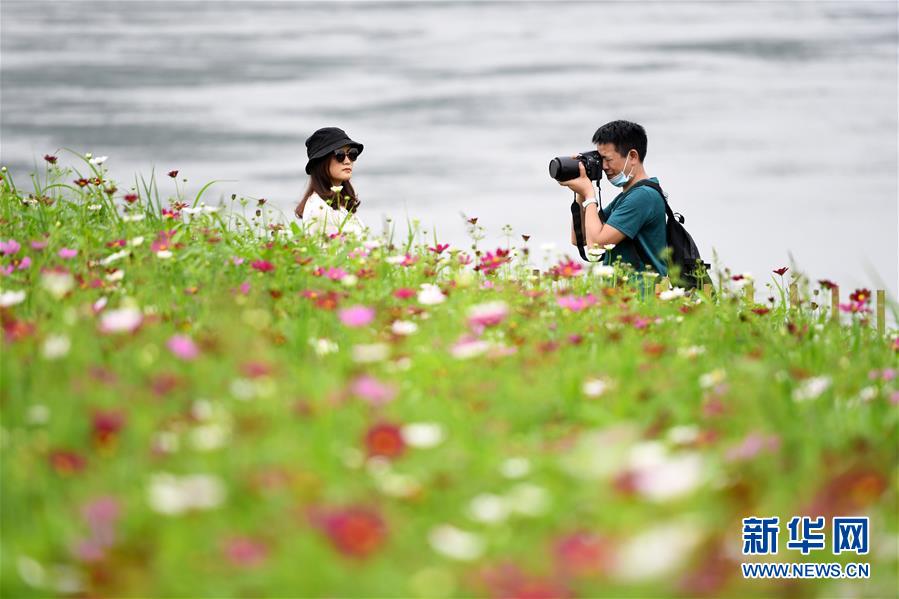 5月20日,在重庆市巴南区木洞镇长江岸边,游客在格桑花海中拍照留念。 近日,重庆市巴南区木洞镇长江岸边的格桑花竞相开放,吸引游客前来赏花观景。 新华社记者 唐奕 摄