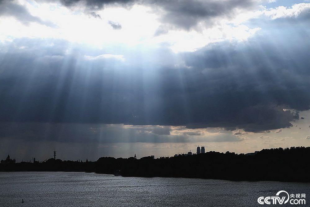 央视网消息(吴胡荼) 5月21日下午时分,哈尔滨松花江江面上空被乌云覆盖,阳光从云层中穿隙而下,构成如梦似幻的光瀑景观。