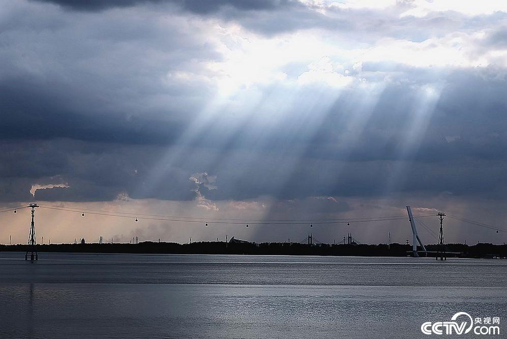 5月21日下午时分,哈尔滨松花江江面上空被乌云覆盖,阳光从云层中穿隙而下,构成如梦似幻的光瀑景观。