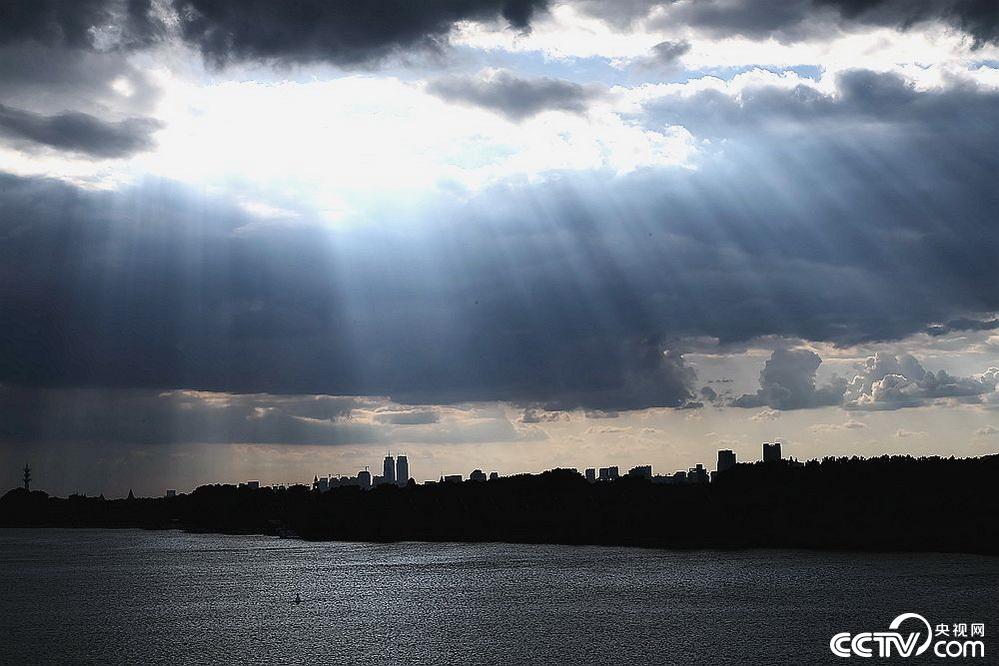 5月21日下午时分,哈尔滨松花江江面上空被乌云覆盖,阳光从云层中穿隙而下,构成如梦似幻的光瀑景观。