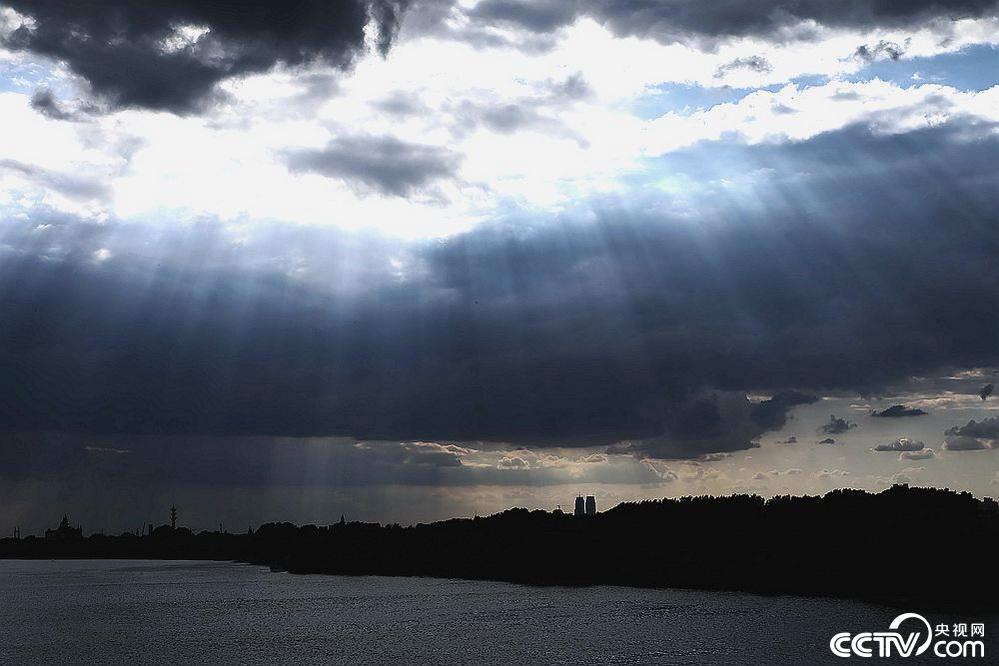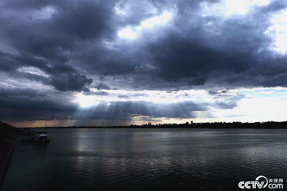 5月21日下午时分,哈尔滨松花江江面上空被乌云覆盖,阳光从云层中穿隙而下,构成如梦似幻的光瀑景观。