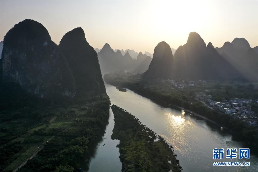 这是在广西桂林市阳朔县兴坪镇拍摄的山水风光(5月19日摄,无人机照片)。 “苍苍森八桂,兹地在湘南。江作青罗带,山如碧玉篸……”一千多年前,唐朝诗人韩愈写尽桂林山水之美。初夏时节,在广西桂林市阳朔县兴坪镇,蓝天白云下,烟雨朦胧中,桂林山水尽显秀美。 新华社记者 曹祎铭 摄