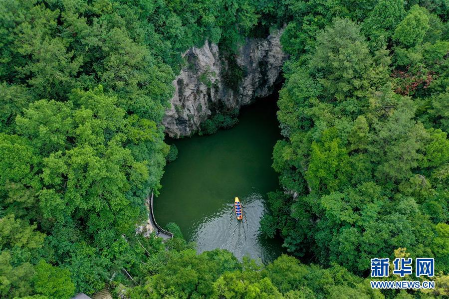 6月9日,游船行驶在贵阳市天河潭旅游度假区内(无人机照片)。 夏日的贵阳市天河潭旅游度假区草木苍翠,风景如画,吸引游客来此休闲游玩。 新华社记者 欧东衢 摄