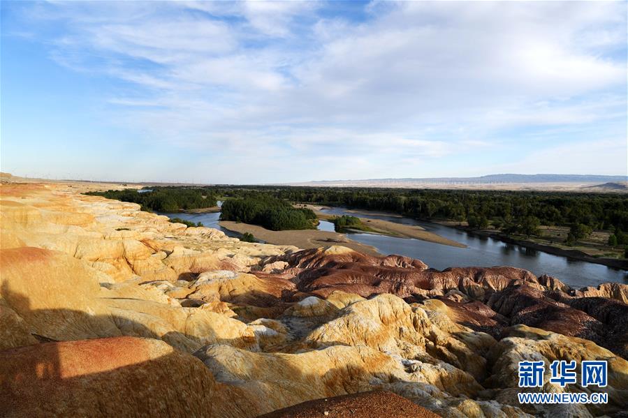 这是6月23日拍摄的新疆阿勒泰地区布尔津县境内的额尔齐斯河畔五彩滩景区景色。 五彩滩景区位于新疆阿勒泰地区布尔津县城以北20多公里的额尔齐斯河北岸,属于典型的雅丹地貌,吸引国内外游客和摄影爱好者前来游览、拍摄。 新华社记者 沙达提 摄
