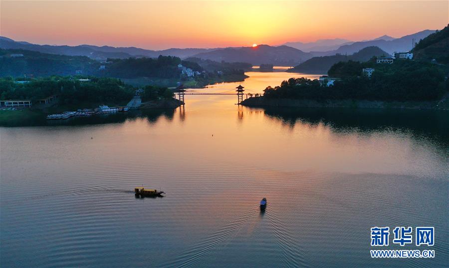 6月24日,夕阳映红了瀛湖湖面(无人机照片)。新华社记者 陶明 摄