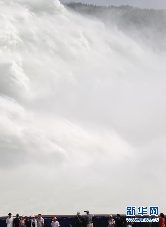 6月25日,游客观看黄河小浪底水库泄洪。 当日,位于河南济源的黄河小浪底水库按4200立方米每秒流量泄洪,巨大的水流喷涌而出,再现“黄河之水天上来”的壮观景象。 新华社发(苗秋闹 摄)