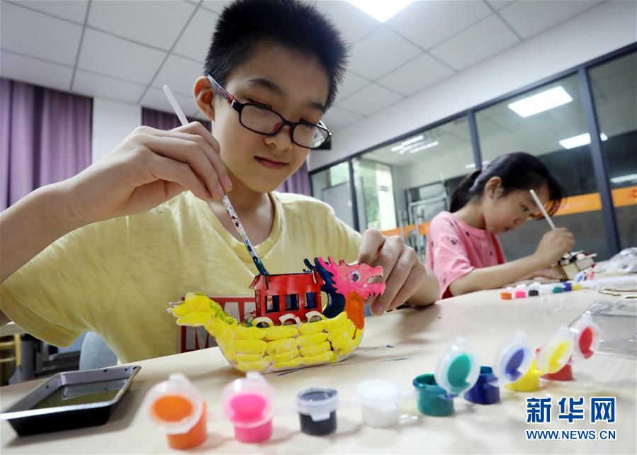 6月25日,江苏省苏州市姑苏区金阊街道朱家庄社区的孩子们给龙船模型上色。 当日是端午节,人们用各种方式庆祝佳节,尽享假日时光。 新华社发(杭兴微 摄)