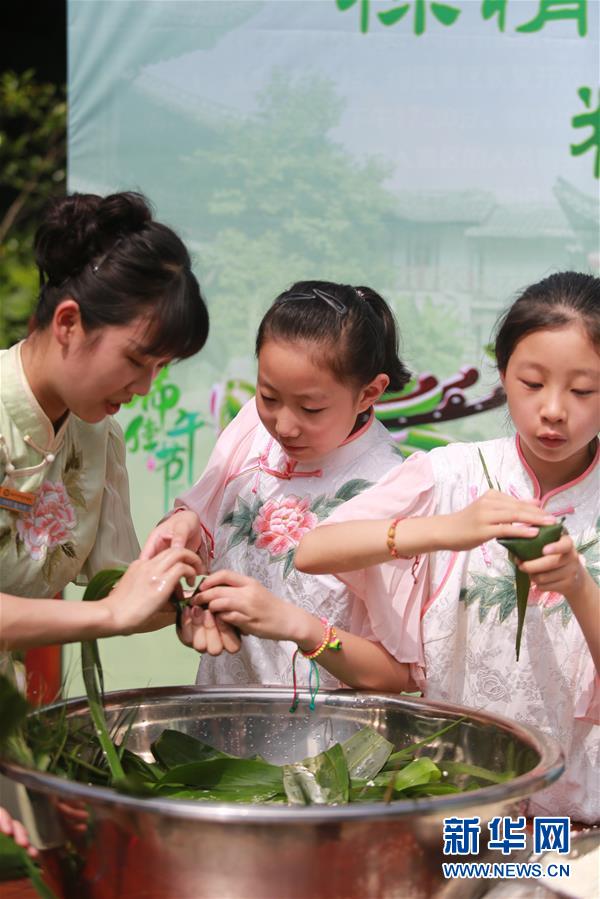 6月25日,在江苏省扬州市何园景区,何园导游和小朋友一起包粽子。 当日是端午节,人们用各种方式庆祝佳节,尽享假日时光。 新华社发(孟德龙 摄)