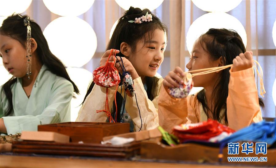6月25日,在河北省石家庄桥西区东园传统文化体验基地,学生互相交流制作中药香囊的心得。 当日是端午节,人们用各种方式庆祝佳节,尽享假日时光。 新华社发(陈其保 摄)