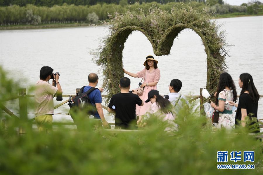 6月25日,游客在宁夏银川市鸣翠湖国家湿地公园游玩拍照。 端午小长假期间,宁夏银川市短线游升温。一些市民选择距离较近的生态旅游景点,亲近大自然,欢度假期。 新华社记者 王鹏 摄