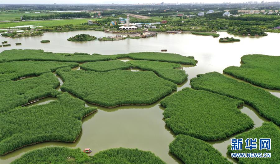 宁夏银川市鸣翠湖国家湿地公园(无人机照片,6月25日摄)。 端午小长假期间,宁夏银川市短线游升温。一些市民选择距离较近的生态旅游景点,亲近大自然,欢度假期。 新华社记者 王鹏 摄