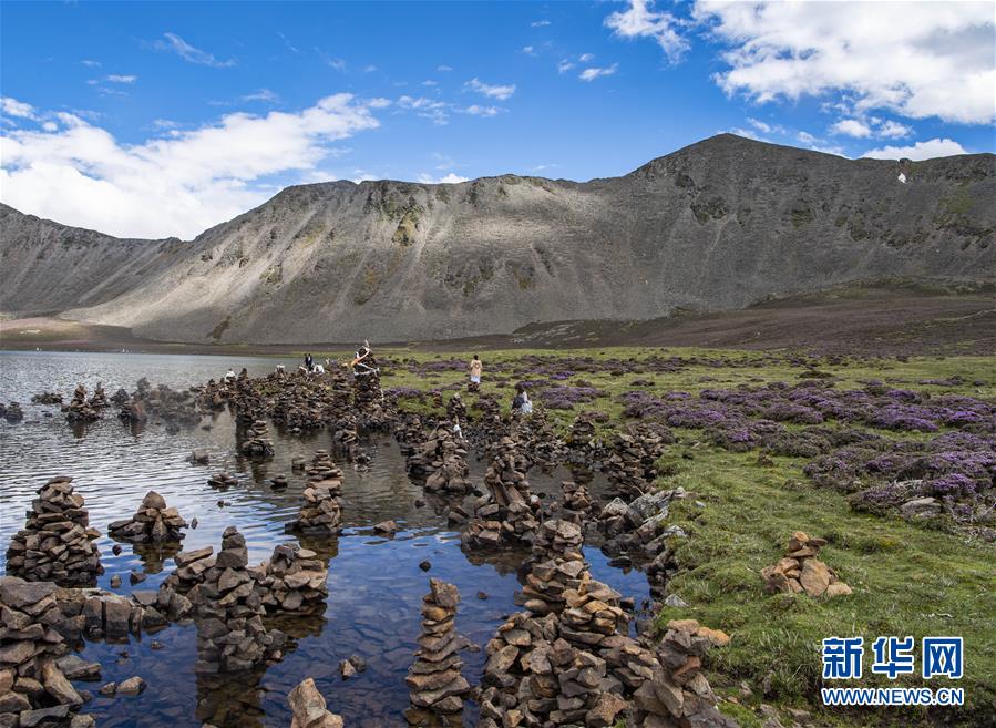游客徜徉在思金拉错湖边的花丛里(6月26日摄)。 思金拉错湖位于西藏拉萨市墨竹工卡县,四周群山高耸,湖面海拔约4500米。每年春夏两季,湖畔山花遍地、绿草如茵,吸引不少游客。 新华社记者孙非摄