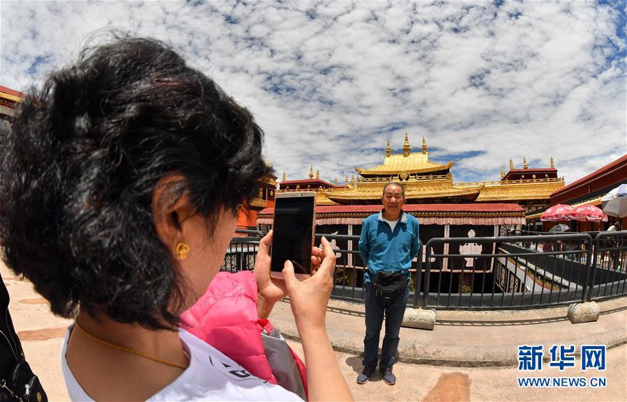 7月2日,游客在大昭寺金顶前留影。当日起,在暂停对外开放五个多月后,西藏大昭寺恢复对外开放。 新华社记者 晋美多吉 摄
