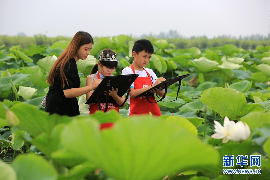 7月3日,游客在曲周县胜丰莲藕种植专业合作社荷塘景区写生。 时值夏日,河北省曲周县胜丰莲藕种植专业合作社荷塘景区的荷花竞相绽放,吸引众多游人前来观光游览。 新华社记者 王晓 摄