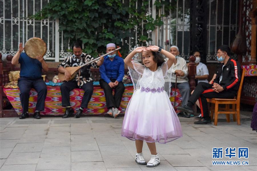 在乌鲁木齐大巴扎景区,小朋友跟着音乐起舞(7月4日摄)。 夏日周末,乌鲁木齐市大巴扎景区内熙熙攘攘,人们来到这里品尝美食、休闲购物。2018年,经过靓化改造后的大巴扎景区新增长约800米的步行街,分为文创文旅和“非遗”项目街区、国际时尚街区和大巴扎美食街区,是乌鲁木齐最受欢迎的旅游目的地之一。 新华社记者 丁磊 摄