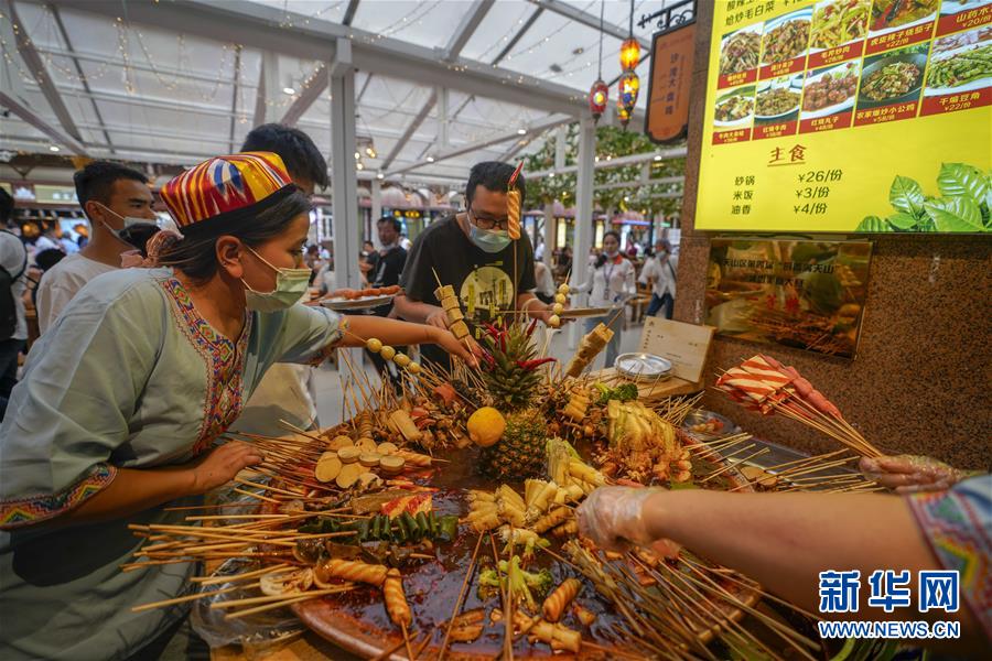 游客在乌鲁木齐大巴扎景区挑选麻辣烫(7月4日摄)。 夏日周末,乌鲁木齐市大巴扎景区内熙熙攘攘,人们来到这里品尝美食、休闲购物。2018年,经过靓化改造后的大巴扎景区新增长约800米的步行街,分为文创文旅和“非遗”项目街区、国际时尚街区和大巴扎美食街区,是乌鲁木齐最受欢迎的旅游目的地之一。 新华社记者 赵戈 摄