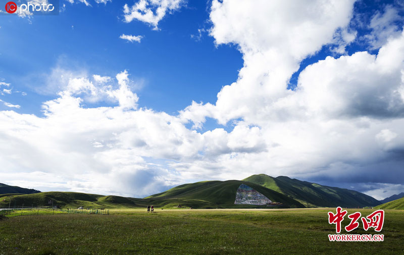 夏季的317国道,藏区草原湛蓝的天空白云朵朵,如雪莲簇拥,似哈达飘飞,犹如莲花幻境。那草原上的小花、牛羊、牧人;那弯曲的公路和村舍;那皑皑白雪山峰和安详打坐的喇嘛,草原的风光就是一幅极美的图画!摄于西藏那曲地区。王愚宁/IC photo