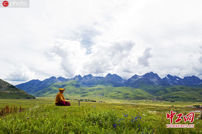 夏季的317国道,藏区草原湛蓝的天空白云朵朵,如雪莲簇拥,似哈达飘飞,犹如莲花幻境。那草原上的小花、牛羊、牧人;那弯曲的公路和村舍;那皑皑白雪山峰和安详打坐的喇嘛,草原的风光就是一幅极美的图画!摄于川西甘孜地区。王愚宁/IC photo