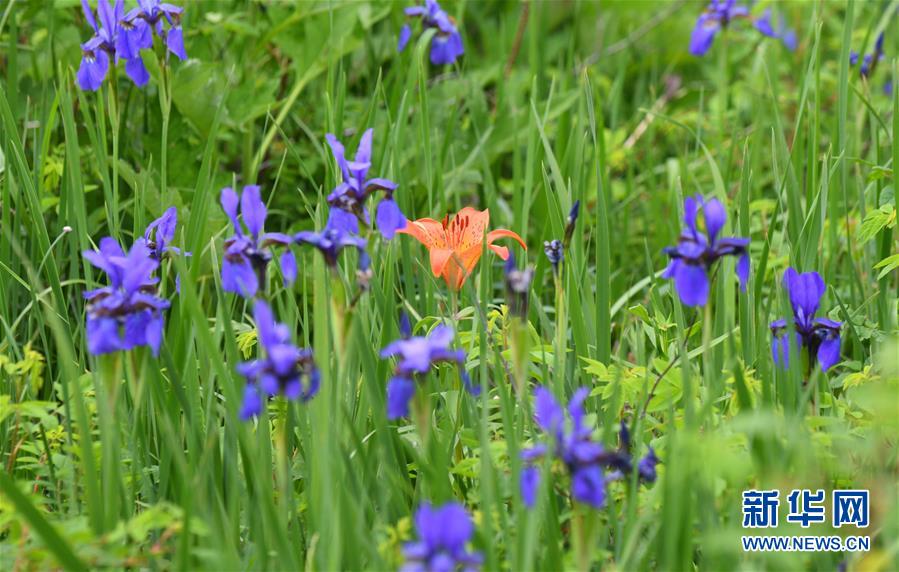 7月9日,在长白山西景区高山花园,百合在鸢尾花丛中盛开。 近日,有着“空中花园”之称的长白山西景区高山花园百花绽放,数千公顷的各类花卉争奇斗艳,吸引游客前来观赏。 新华社记者 林宏 摄