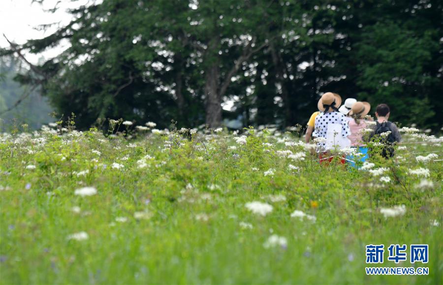 7月9日,游客在长白山西景区高山花园游玩。 近日,有着“空中花园”之称的长白山西景区高山花园百花绽放,数千公顷的各类花卉争奇斗艳,吸引游客前来观赏。 新华社记者 林宏 摄