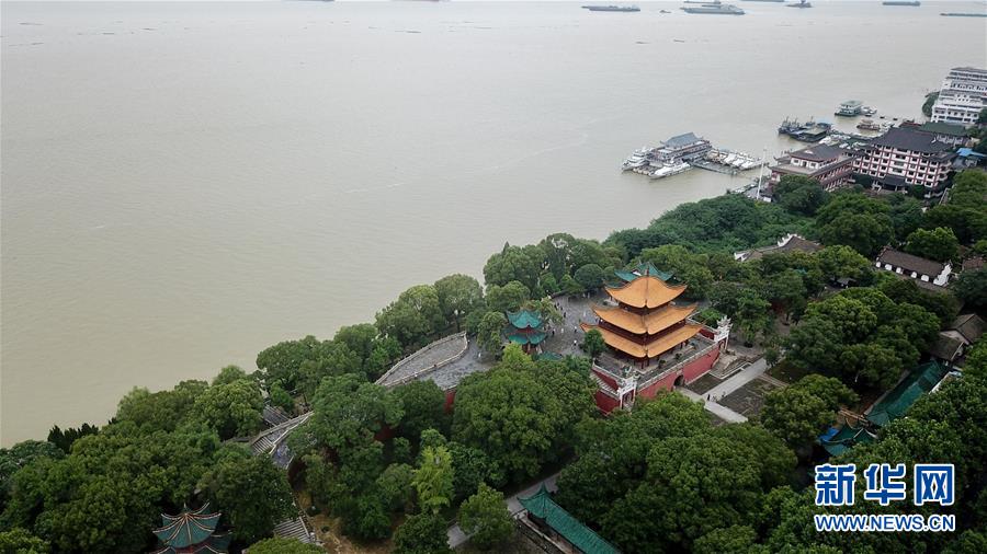 7月13日拍摄岳阳楼景区,旁边的洞庭湖处于超警戒水位状态(无人机照片)。 近日,受上游来水持续加大和长江洪水顶托等影响,洞庭湖水位上涨,导致湖南省岳阳市的岳阳楼景区部分景点被淹。目前,岳阳楼景区已限制游客数量,封闭相关路口,并通过广播提醒游客注意安全。 新华社记者 陈泽国 摄