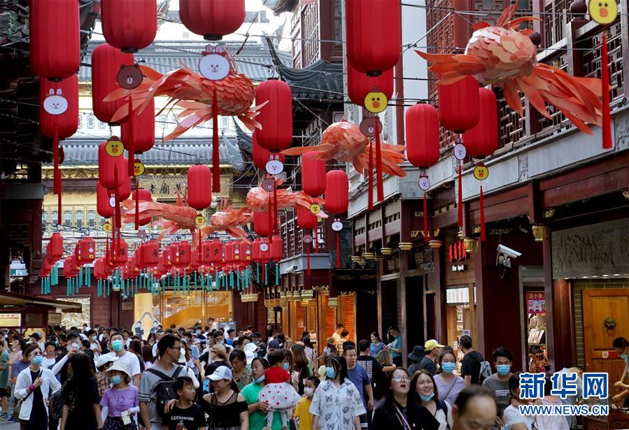 8月1日,上海豫园的灯笼上装饰着布朗熊等卡通形象。 进入8月,上海豫园进入“暑期档”。卡通形象布朗熊、可妮兔等亮相豫园,为热闹的市集增添了童趣;清凉喷雾、文创冰品等为游客在酷暑中送上清凉。 新华社记者 刘颖 摄