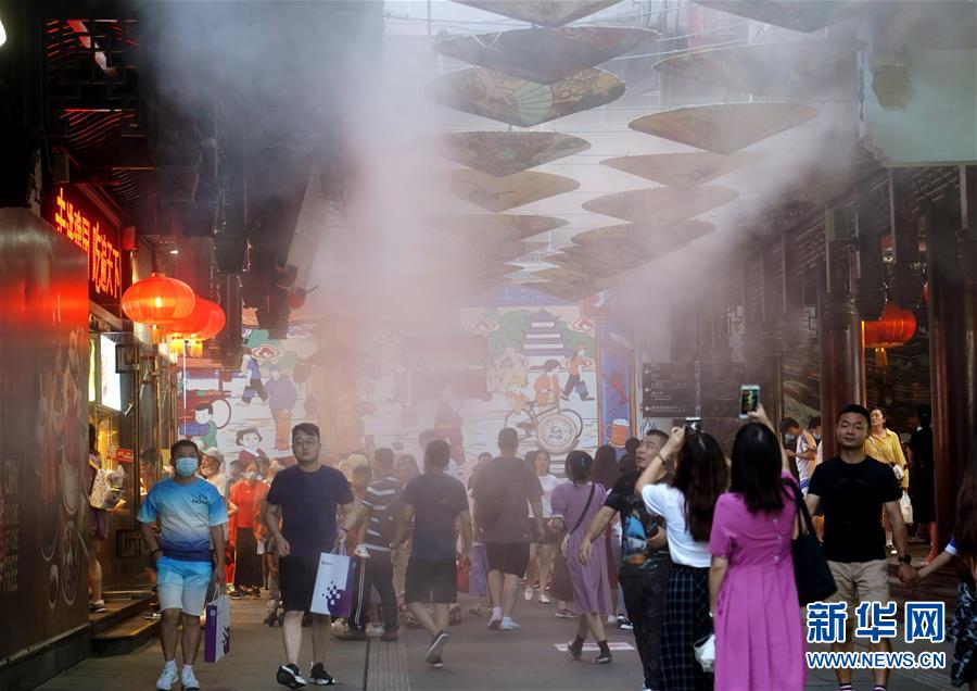 8月1日,豫园的清凉喷雾为游客降温。 进入8月,上海豫园进入“暑期档”。卡通形象布朗熊、可妮兔等亮相豫园,为热闹的市集增添了童趣;清凉喷雾、文创冰品等为游客在酷暑中送上清凉。 新华社记者 刘颖 摄