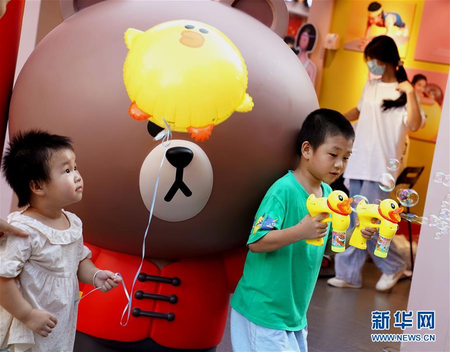 8月1日,小游客在上海豫园与布朗熊玩偶合影。 进入8月,上海豫园进入“暑期档”。卡通形象布朗熊、可妮兔等亮相豫园,为热闹的市集增添了童趣;清凉喷雾、文创冰品等为游客在酷暑中送上清凉。 新华社记者 刘颖 摄