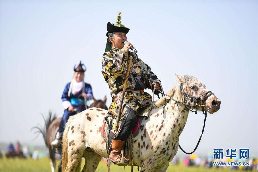 8月2日,演员在开幕式上表演蒙古族传统说唱艺术潮尔道。 当日,锡林浩特市游牧文化节·白音锡勒牧场建场70周年那达慕在锡林浩特市白音锡勒牧场拉开帷幕。赛马、搏克、射箭等蒙古族传统项目吸引游客前来观看。 新华社记者 彭源 摄