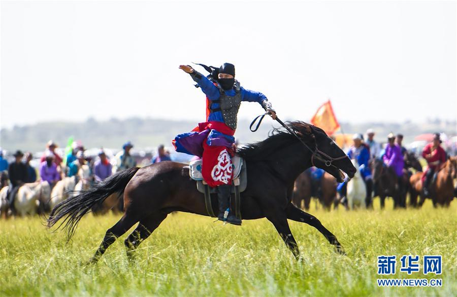 8月2日,民族马术表演者在开幕式上进行表演。 当日,锡林浩特市游牧文化节·白音锡勒牧场建场70周年那达慕在锡林浩特市白音锡勒牧场拉开帷幕。赛马、搏克、射箭等蒙古族传统项目吸引游客前来观看。 新华社记者 彭源 摄