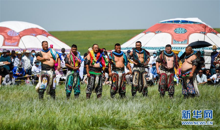 8月2日,搏克手准备进行搏克比赛。 当日,锡林浩特市游牧文化节·白音锡勒牧场建场70周年那达慕在锡林浩特市白音锡勒牧场拉开帷幕。赛马、搏克、射箭等蒙古族传统项目吸引游客前来观看。 新华社记者 连振 摄