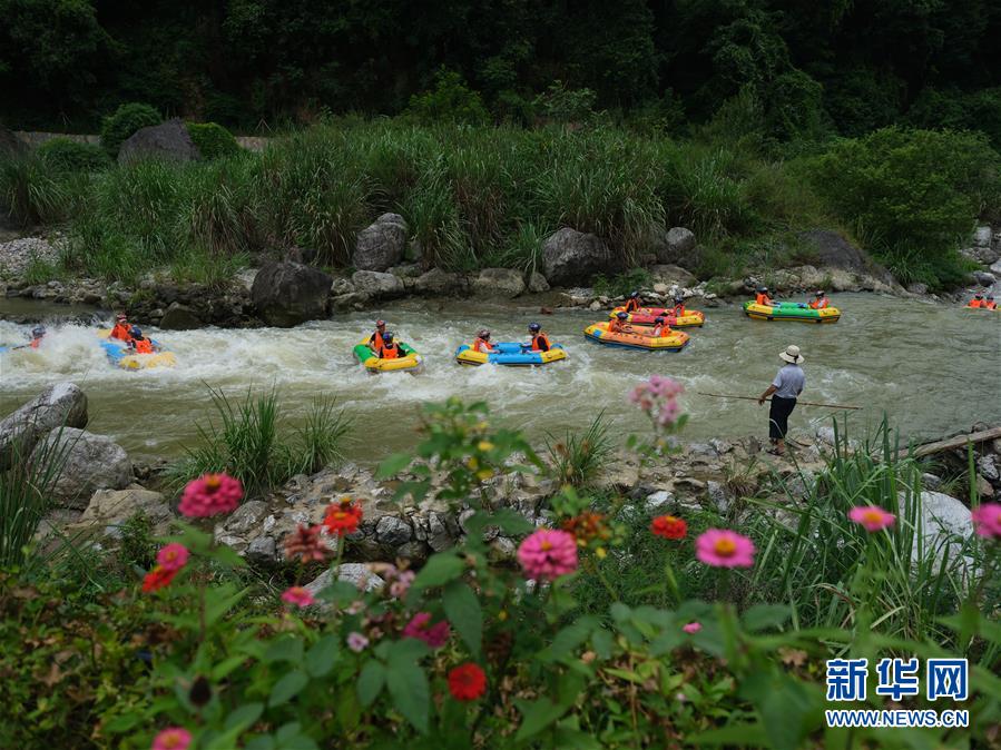 8月8日,游客在兴山县朝天吼漂流景区漂流。