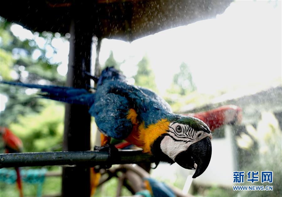 8月11日,上海动物园的金刚鹦鹉在享受喷淋降温。 当日,上海最高温度达到35摄氏度,上海动物园开启园内安装的各种喷淋装置,让动物们防暑降温,乐享清凉。 新华社记者 张建松 摄