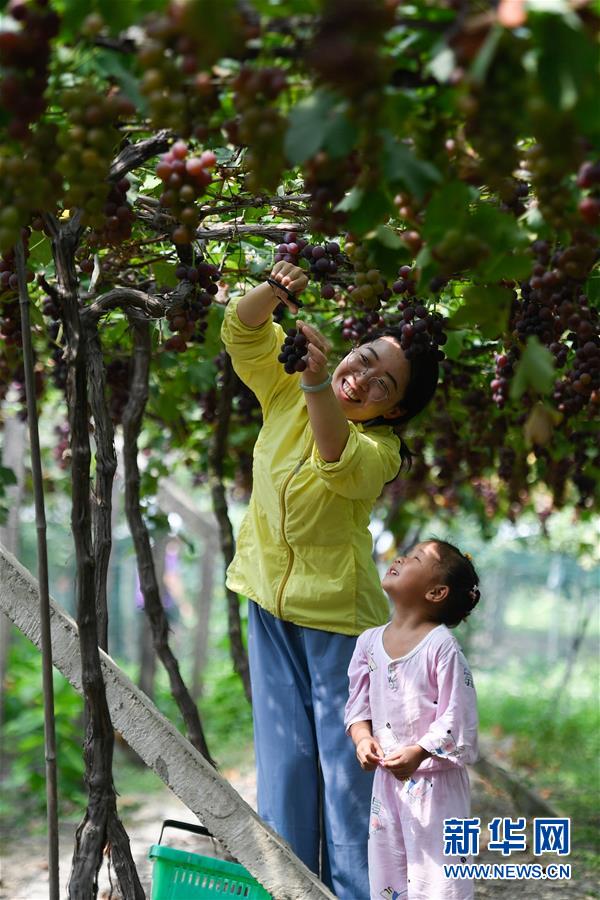 8月21日,游客在湖州市吴兴区八里店镇一家葡萄专业合作社的果园采摘葡萄。 当日,浙江省湖州市吴兴区八里店镇在移沿山景区举办以“畅味丰收、律动八里”为主题的第三届葡萄丰收节,吸引游客前来体验采摘的乐趣。 新华社记者 黄宗治 摄