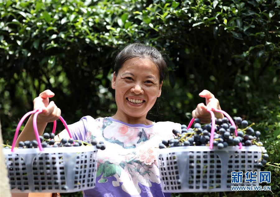 8月23日,在广西三江侗族自治县同乐苗族乡归东村,游客展示刚摘下的葡萄。 新华社发(梁克川 摄)