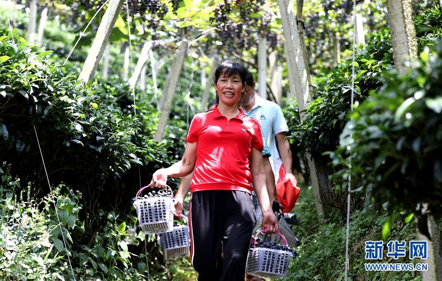 8月23日,在广西三江侗族自治县同乐苗族乡归东村,游客体验葡萄采摘。 新华社发(梁克川 摄)