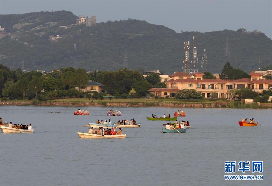 8月23日,游人在巴基斯坦伊斯兰堡的一处公园划船。 伊斯兰堡这处因新冠疫情关闭的公园近日重新对外开放。 新华社发(艾哈迈德·卡迈勒摄)
