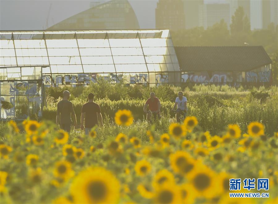 8月23日,人们从德国法兰克福市郊一处向日葵田旁经过。 新华社记者逯阳摄