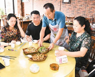 平塘县克度镇村民王顺军(右二)在自家创办的餐厅内为客人上菜。新华社记者 杨文斌摄