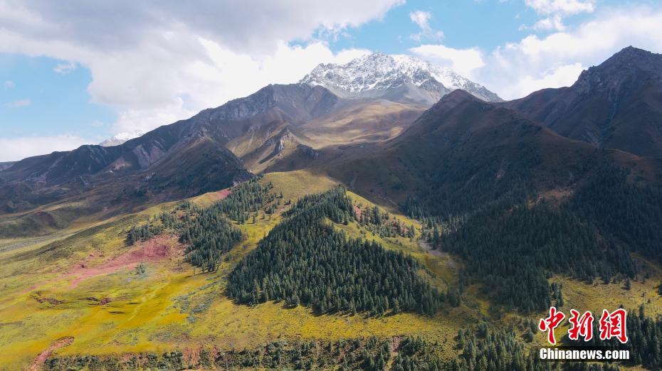 9月9日,航拍祁连山国家公园青海片区油葫芦自然风景区美景。初秋时节,祁连山国家公园青海片区草地渐黄,天高云淡,勾勒出一幅色彩斑斓的秋日美景图。中新社记者 李江宁 摄