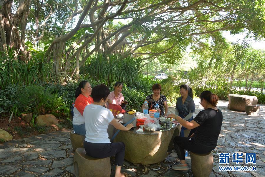 9月18日,在厦门五缘湾湿地公园内,市民在树荫处休憩闲谈。 五缘湾位于厦门岛东北部,面积12.57平方公里。十几年前的五缘湾内分布着大片滩涂、杂乱的鱼塘和垃圾集聚地。经过近年来的清淤造地和生态环境综合治理,目前五缘湾片区内形成了2平方公里的海湾,新增了3平方公里建设土地。厦门市在这里还修建了8公里长的优质生活岸线。原先的“不宜居之地”,成了今天厦门市民和游客的“城市新客厅”。 新华社记者 颜之宏 摄