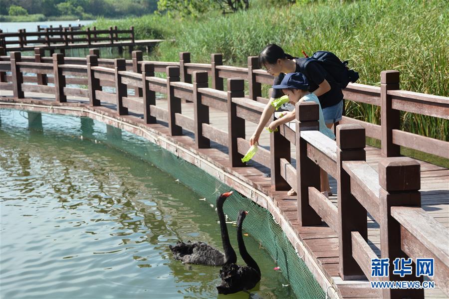 9月18日,在厦门五缘湾湿地公园内,一位家长带着孩子与游弋的黑天鹅亲密互动。 五缘湾位于厦门岛东北部,面积12.57平方公里。十几年前的五缘湾内分布着大片滩涂、杂乱的鱼塘和垃圾集聚地。经过近年来的清淤造地和生态环境综合治理,目前五缘湾片区内形成了2平方公里的海湾,新增了3平方公里建设土地。厦门市在这里还修建了8公里长的优质生活岸线。原先的“不宜居之地”,成了今天厦门市民和游客的“城市新客厅”。 新华社记者 颜之宏 摄